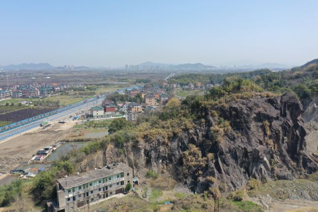 蕭山區(qū)義橋鎮(zhèn)四姑灣礦區(qū)廢棄(關(guān)停)礦山位于蕭山區(qū)與富陽區(qū)交界處,義橋鎮(zhèn)富春村南面,石門水庫西側(cè),緊鄰春永線。該礦山于2015年關(guān)停。礦區(qū)南側(cè)高程+145m以上邊坡已完成治理綠化,部分坡面區(qū)域基巖裸露,坡面受節(jié)理裂隙相互切割影響和風化侵蝕剝蝕作用,局部存在小規(guī)模的掉塊、崩塌等現(xiàn)象;礦區(qū)其余段開挖邊坡由于該礦山不規(guī)則開采,造成礦山遺留邊坡呈高陡邊坡,組成邊坡基巖裸露,邊坡面凹凸不平,局部存在危巖體,存在崩塌隱患;且邊坡坡頂處有大量的堆積土,結(jié)構(gòu)松散,部分堆土表面已出現(xiàn)裂縫,存在滑塌隱患;區(qū)內(nèi)約+30m高程以上部分均為可視范圍,造成較大的視覺污染。